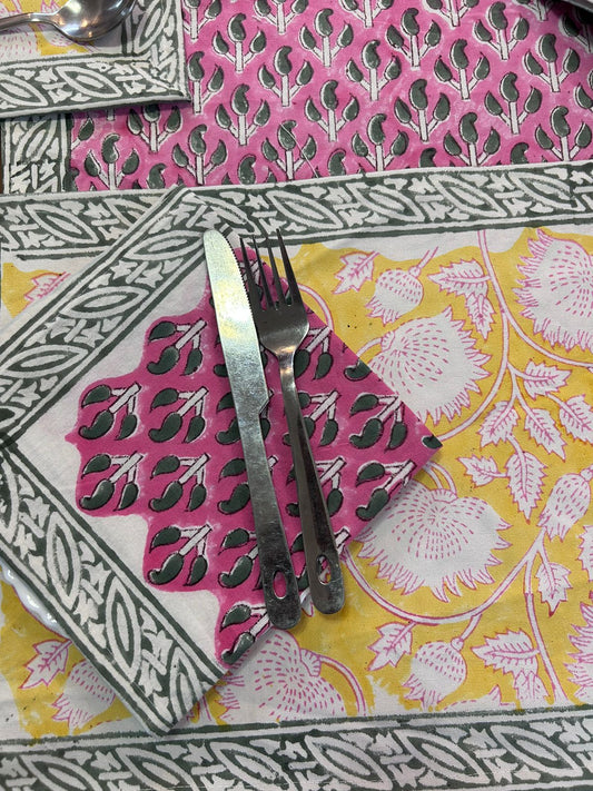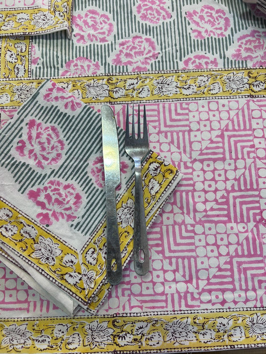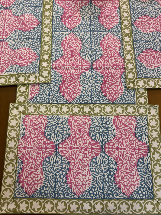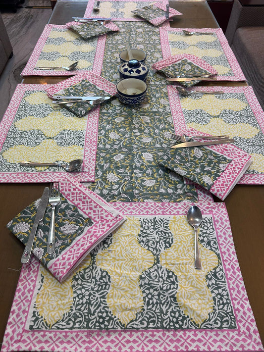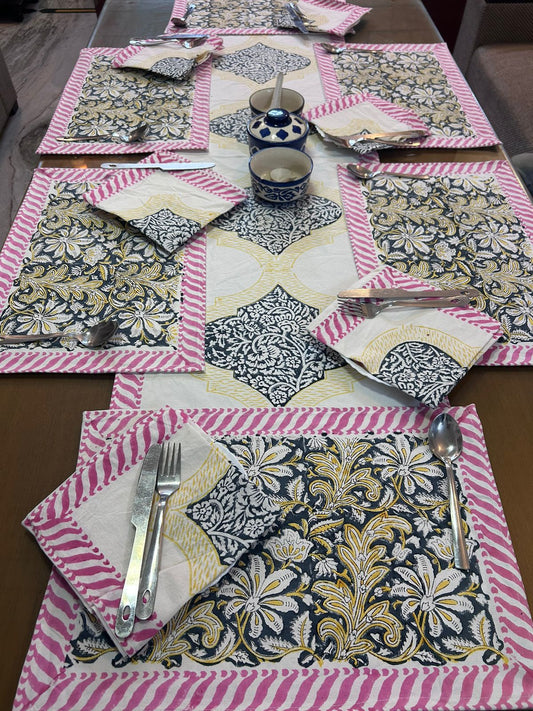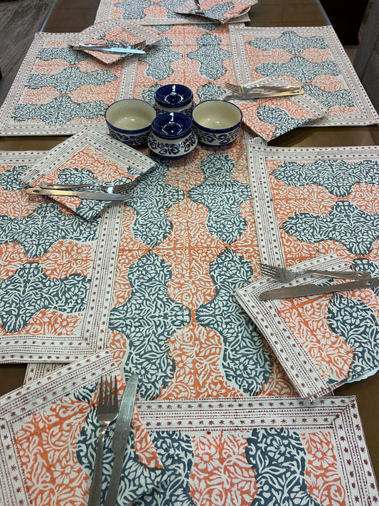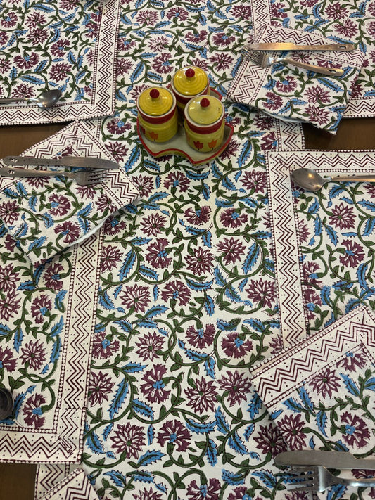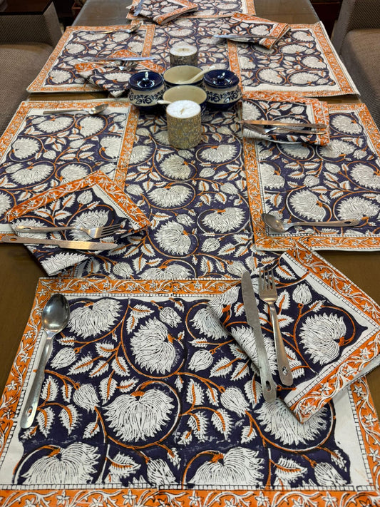 Hand Block Printed Dining Table Cover, Napkins, Mats, Runner