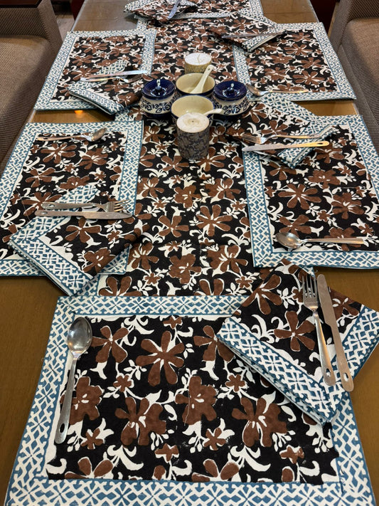 Mocha Floral Dining Set - Runner + 6 Mats + 6 Napkins