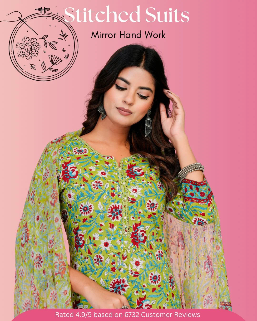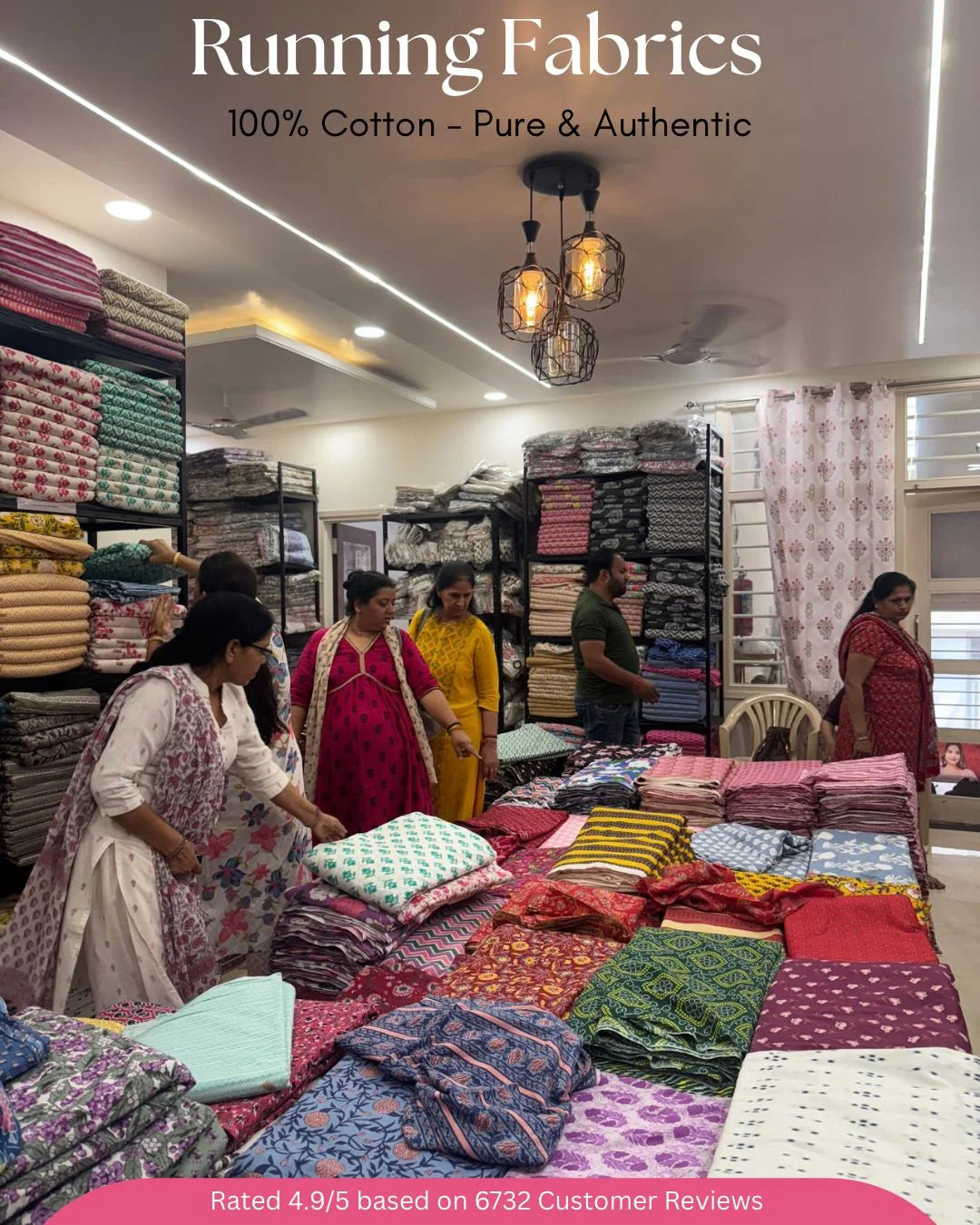 With years of experience in cotton, we source 100% pure cotton yarns with the right composition and thread count, then craft them with जयपुर कारीगरी (block printing and hand embroidery).