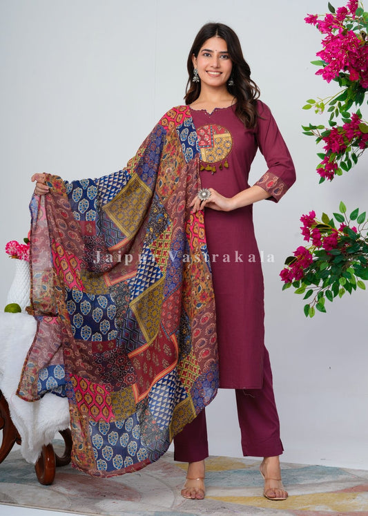 4Burgundy Jungle Embroidery Kurti Pant Coord