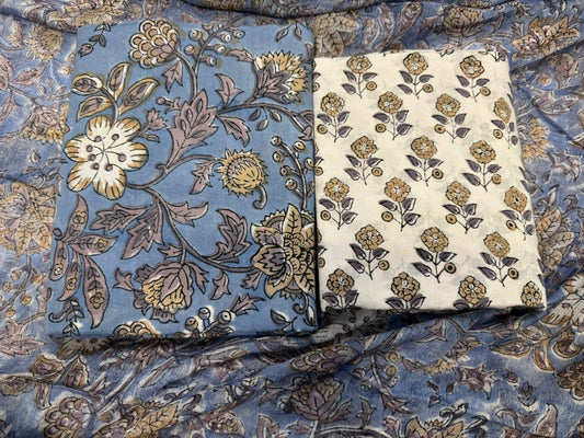 Hand Block Printed Unstitched Cotton Suit with Chiffon Dupatta