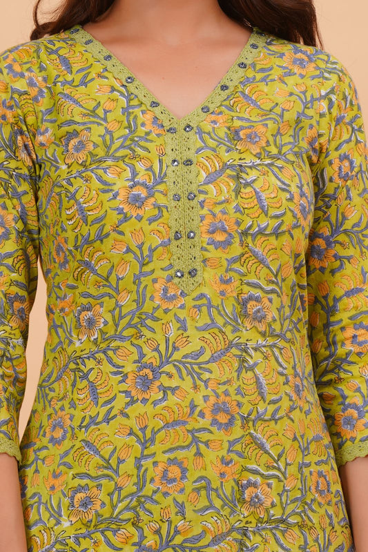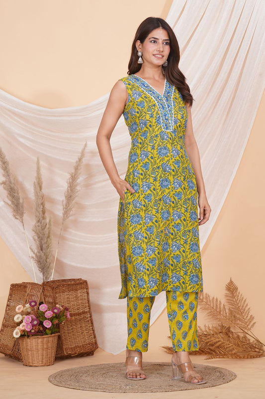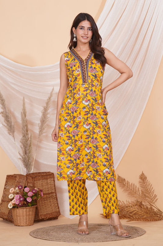 2Yellow Sunlit Blossom Sleeveless Kurta Pant Set