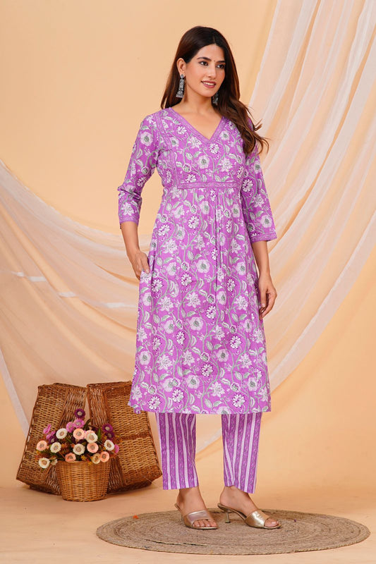 Purple Floral Nayra Embroidery Kurta Pant Set