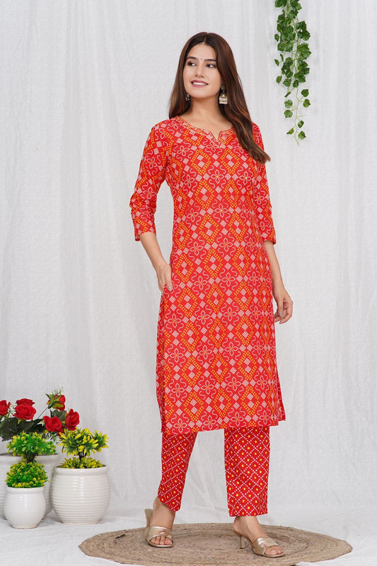 Festive Red Bandhej Kurta Pant Set