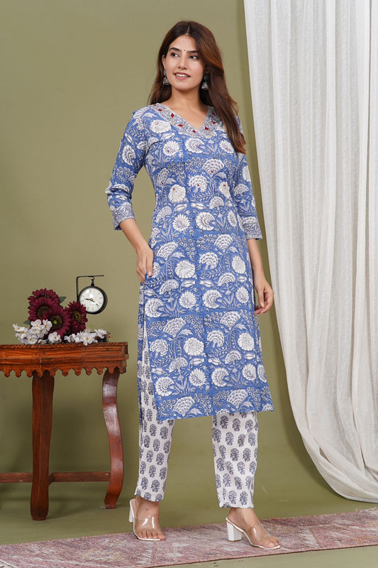 Blue Bouquet Embroidery Kurta Pant Set
