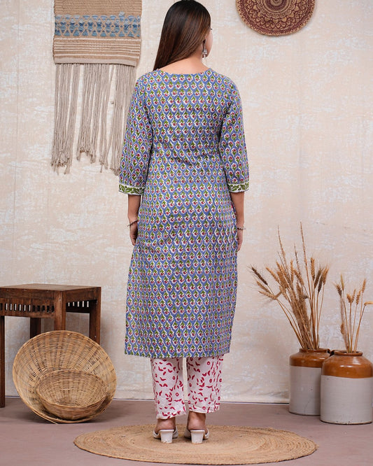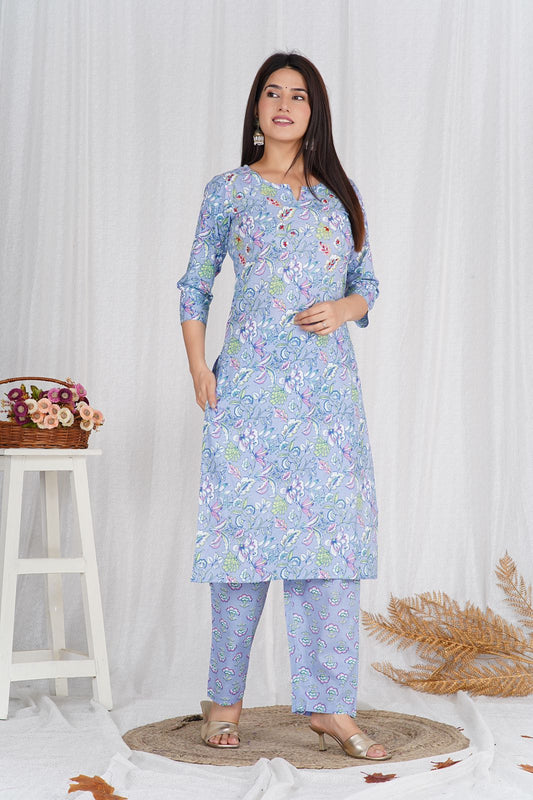 Misty Blue Booti Print Kurta Pant Set