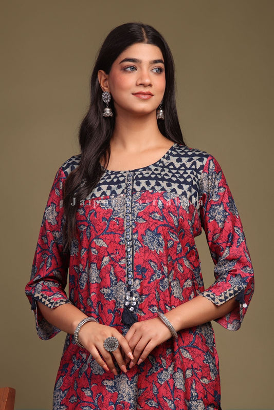 Ruby Red Lehariya Muslin Embroidery Kurti