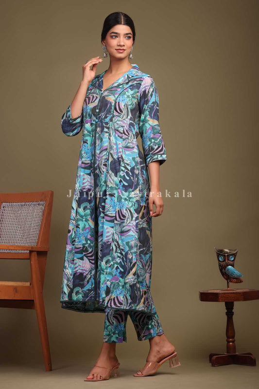 Sapphire Blue Muslin Silk V-Neck Embroidery Suit