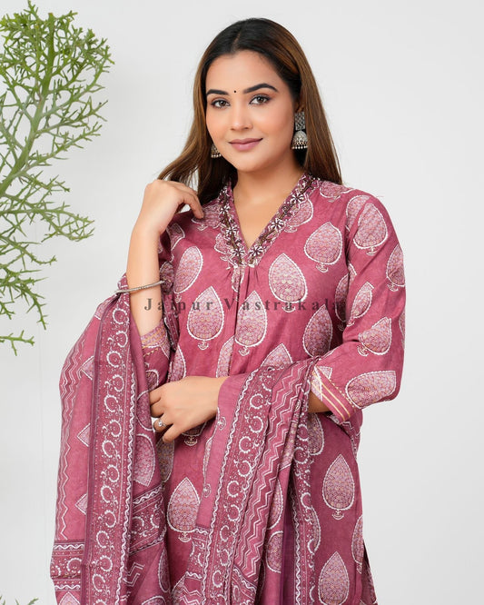 Rosy Blooms Muslin Silk V-Neck Embroidery Suit