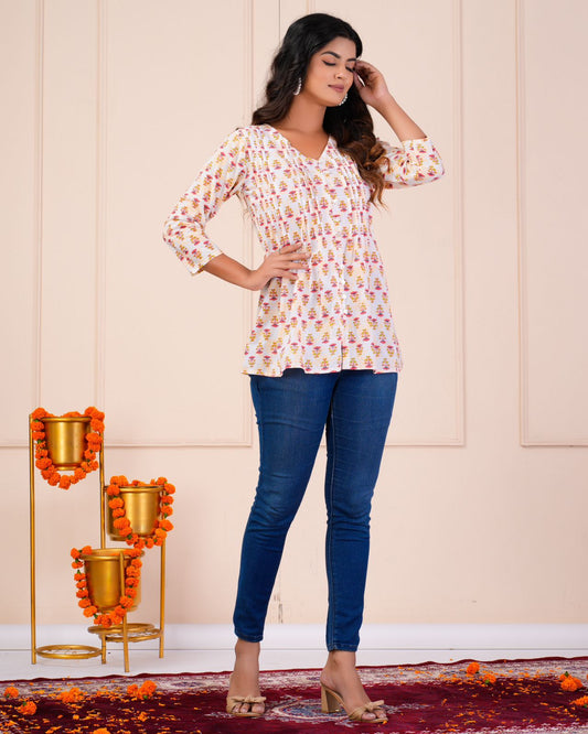 Printed Short Kurtis: From geometric patterns to floral prints, these kurtas will add vibrancy and freshness to your wardrobe.
