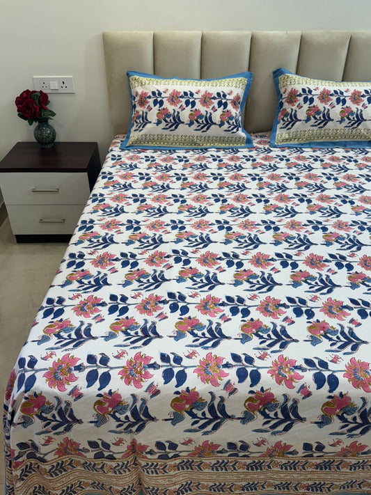 Pink Bloom Blue Whispers Double Bedsheet with Pillow Covers