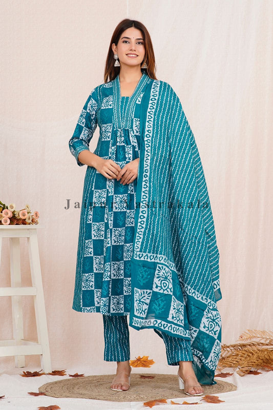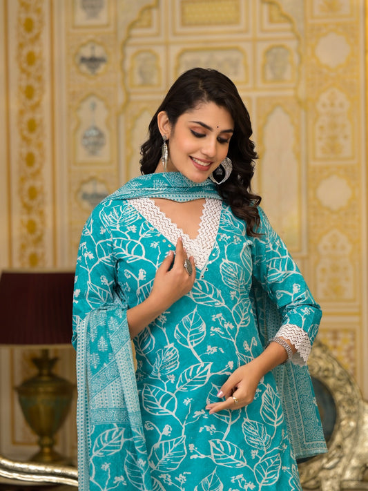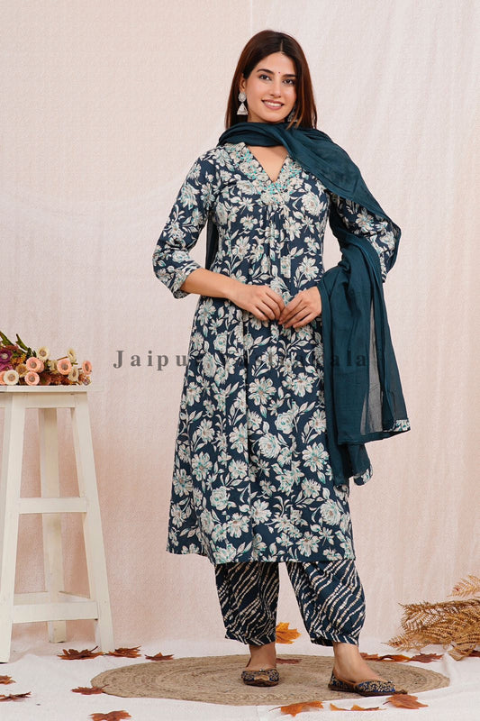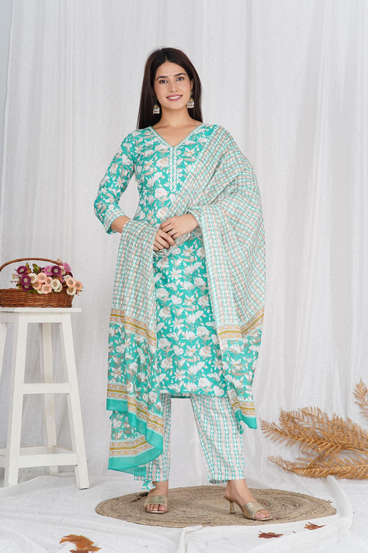 Teal Meadow Embroidery Cotton Dupatta Suit