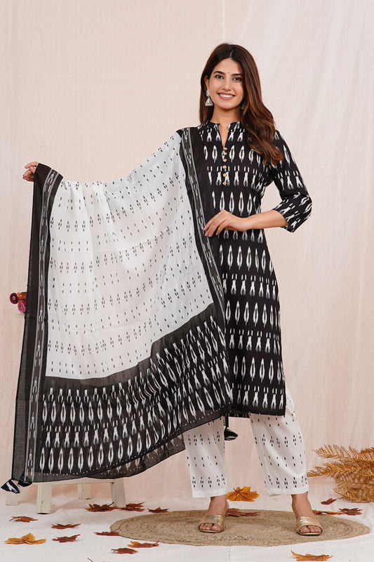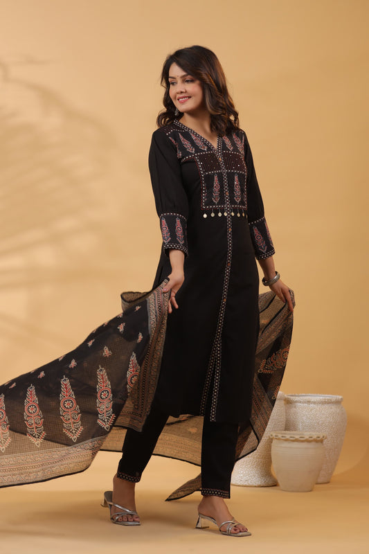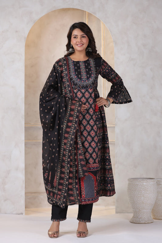 Ethnic Regal Black A-line Cotton Embroidery Suit