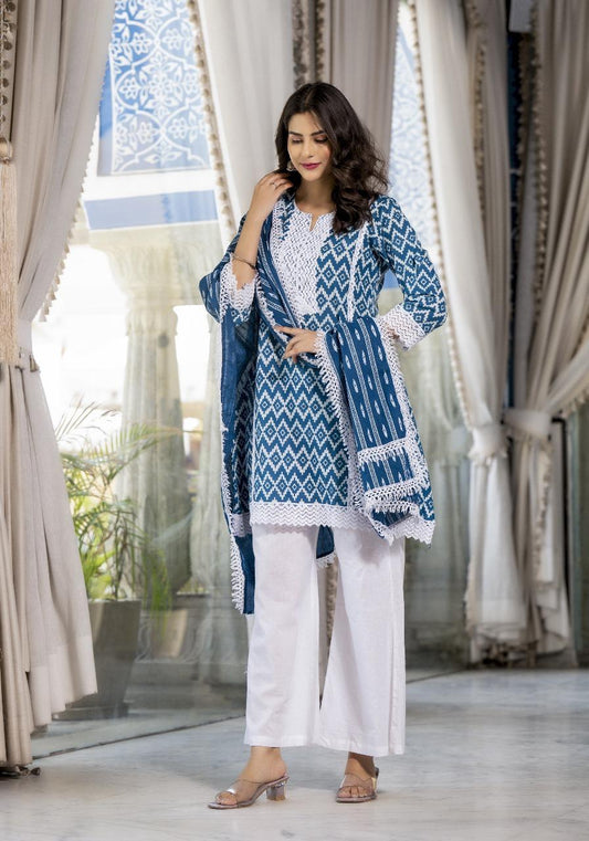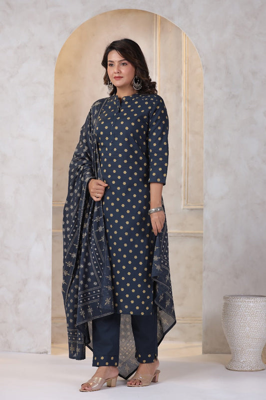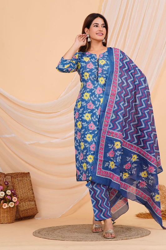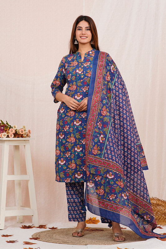 Blue Bouquet Embroidery Cotton Dupatta Suit