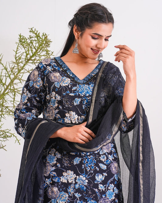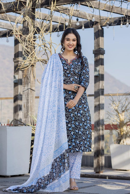 Black Blue Floral Embroidery Cotton Dupatta Suit