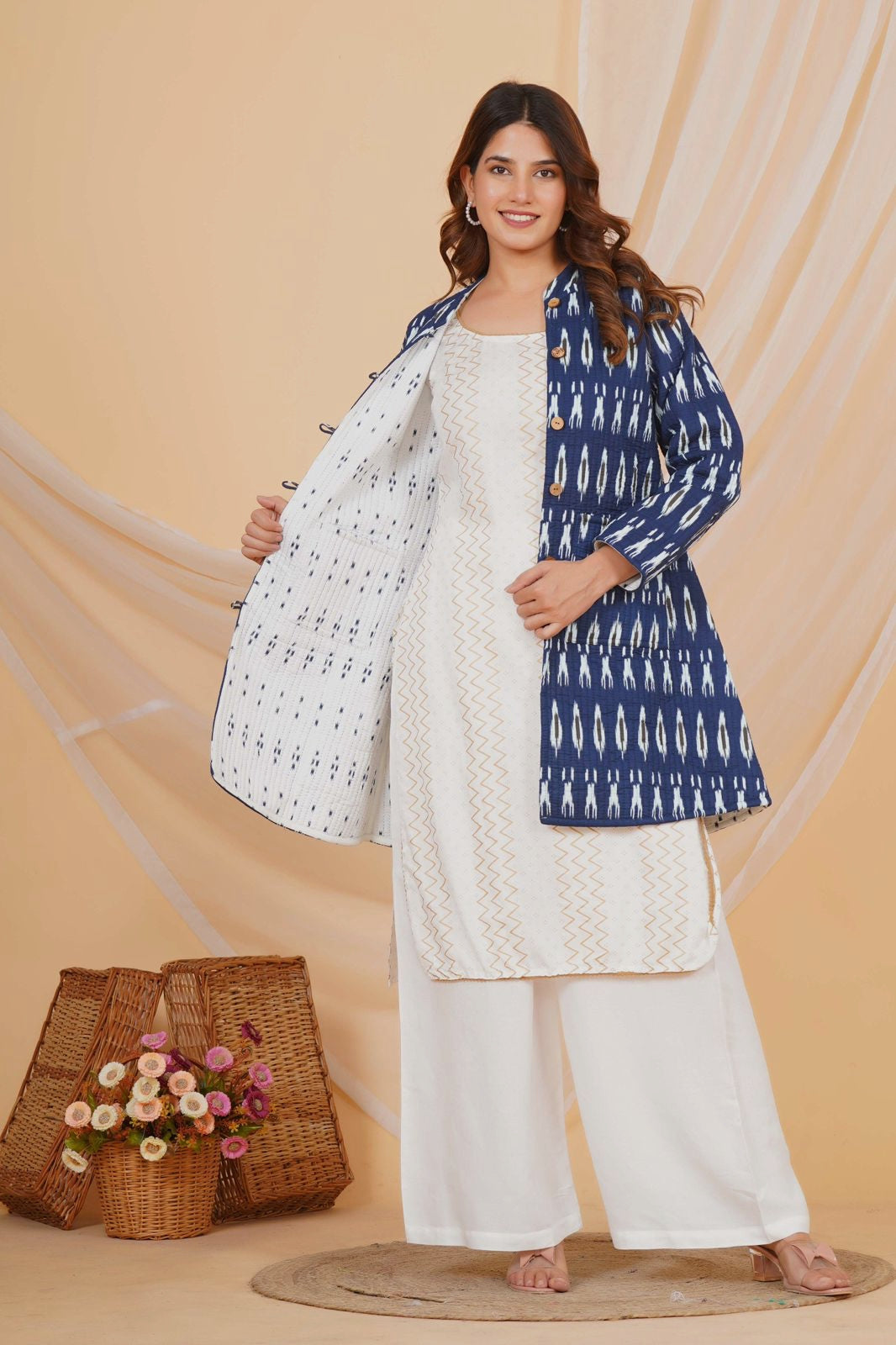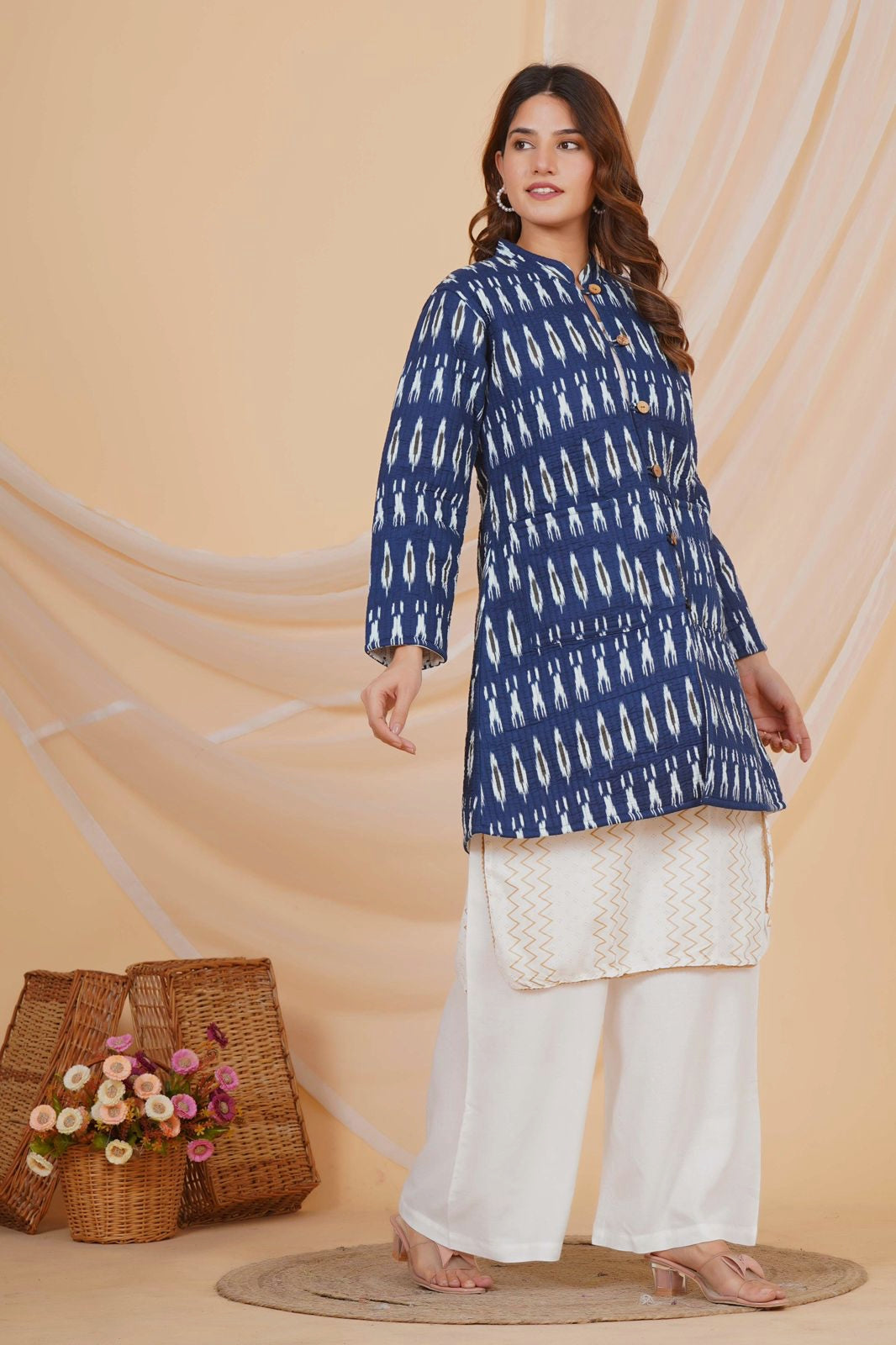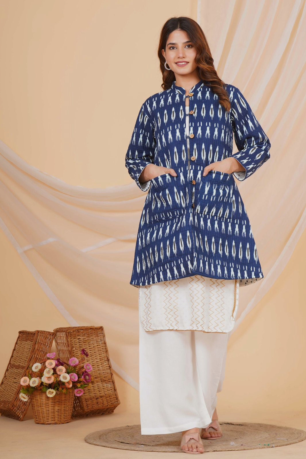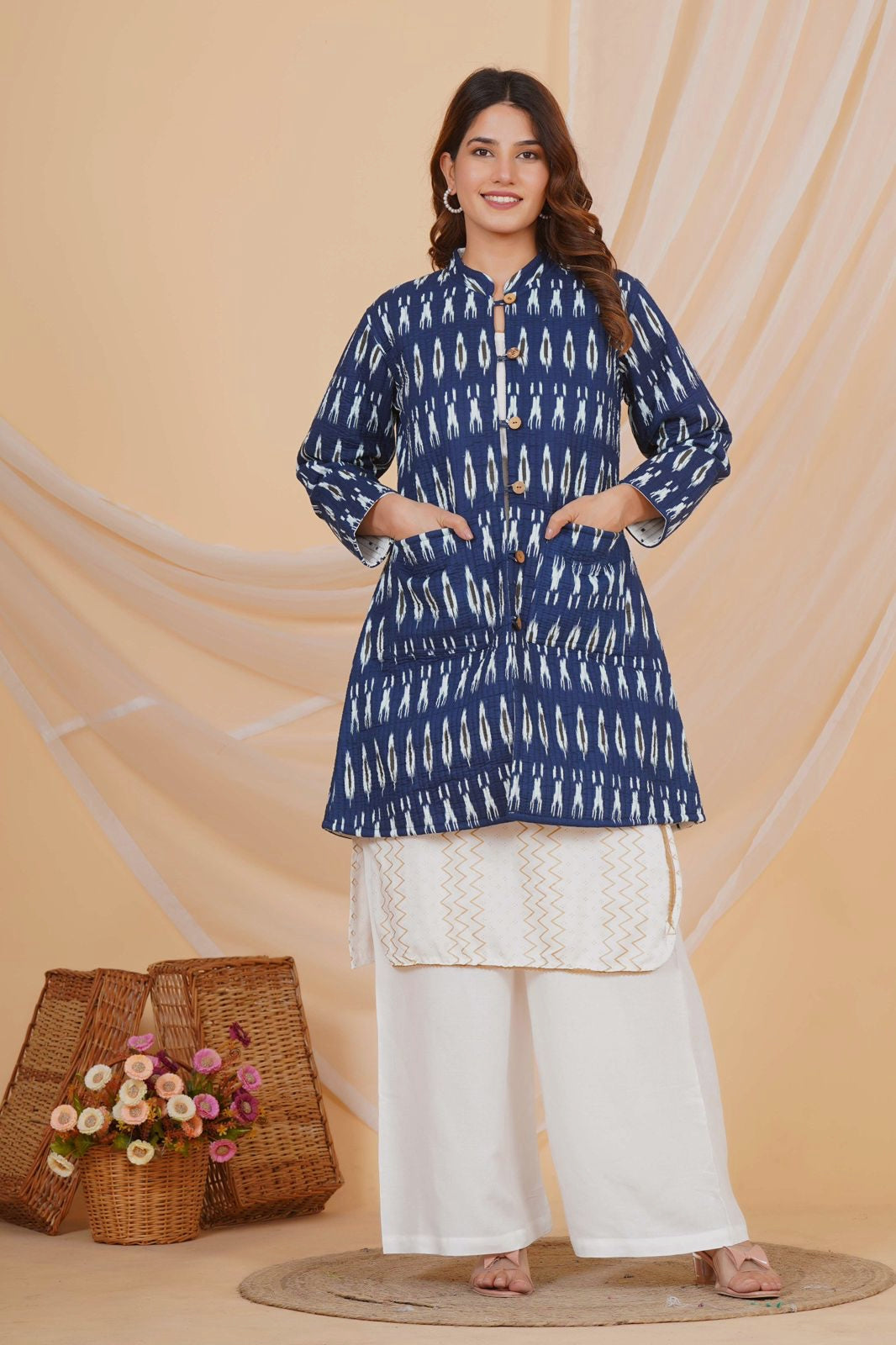 Cotton Quilted Reversible Full Sleeves Long Jacket with Mayo Collar