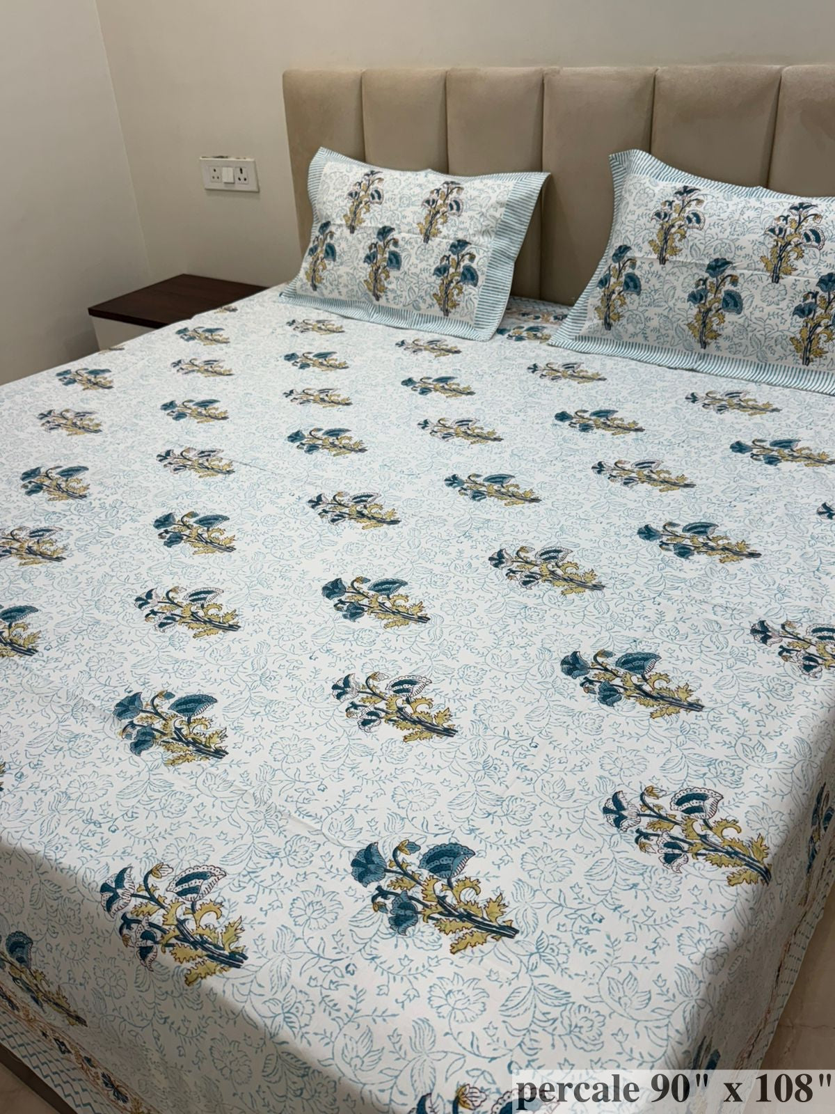 Hand Block Printed Double Bedsheet with Pillow Covers. This bedsheet is made from percale cotton, one of the finest fabrics for bed linens. It feels soft and comfortable on the skin. The fabric has a smooth matte finish with a crisp, fresh touch that gives a clean and premium feel.