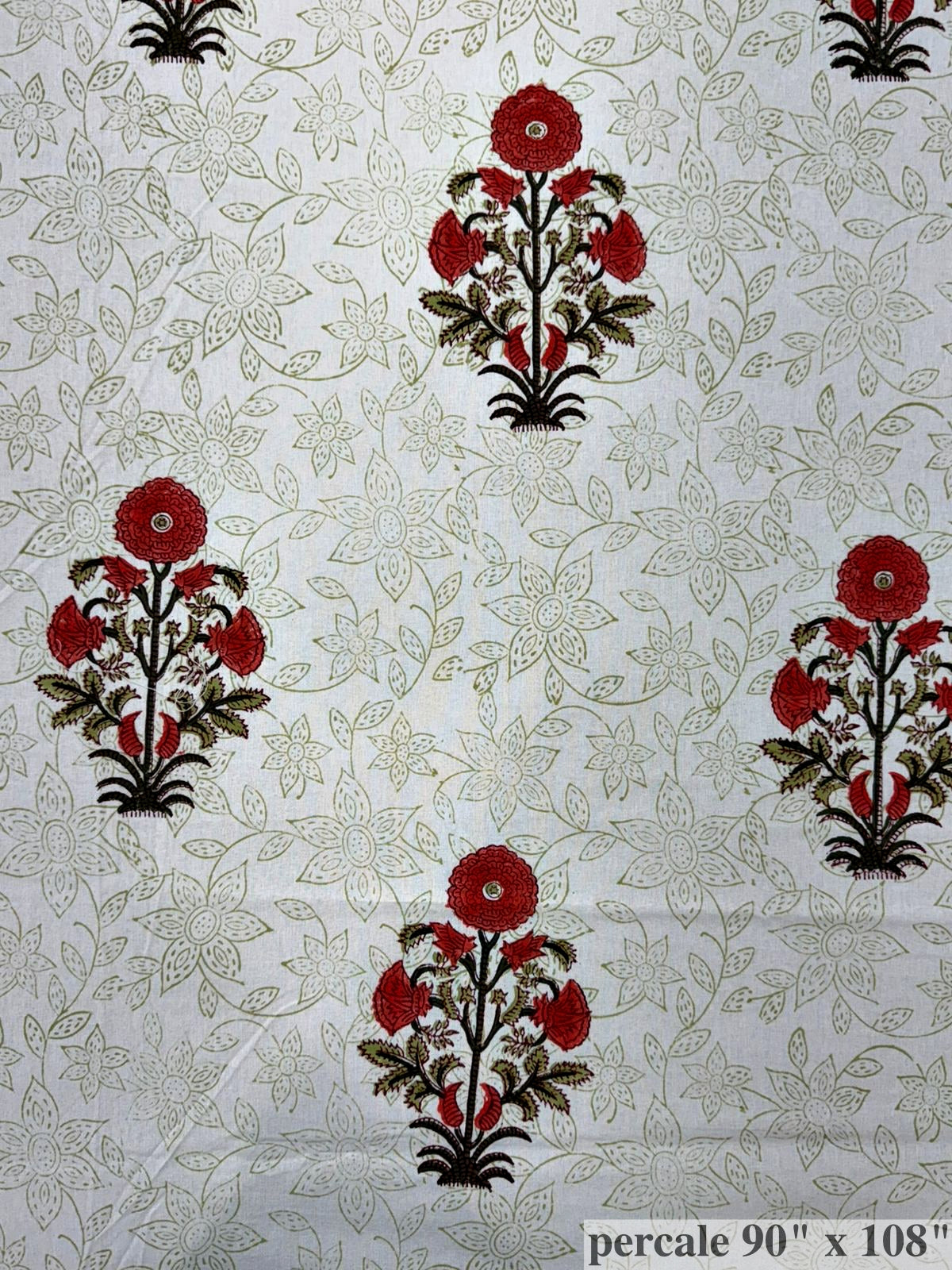 Hand Block Printed Double Bedsheet with Pillow Covers. This bedsheet is made from percale cotton, one of the finest fabrics for bed linens. It feels soft and comfortable on the skin. The fabric has a smooth matte finish with a crisp, fresh touch that gives a clean and premium feel.