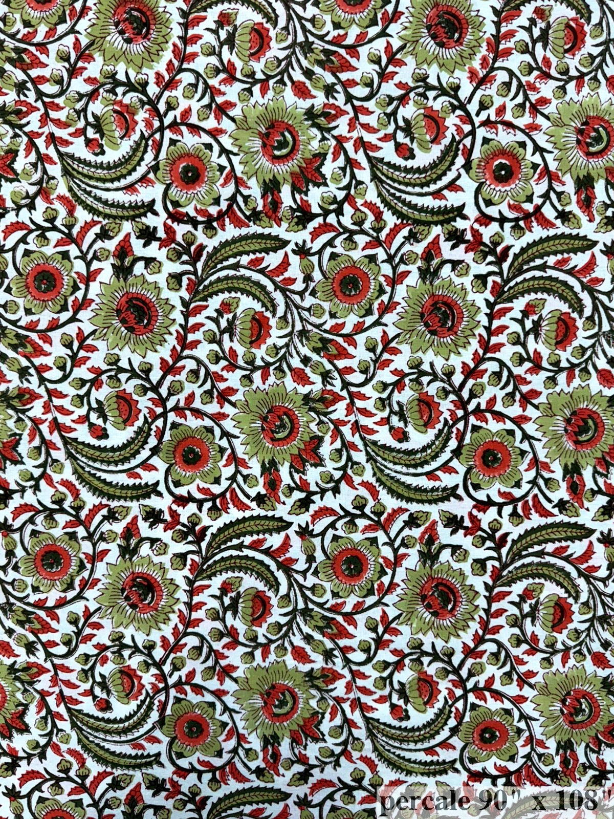 Hand Block Printed Double Bedsheet with Pillow Covers. This bedsheet is made from percale cotton, one of the finest fabrics for bed linens. It feels soft and comfortable on the skin. The fabric has a smooth matte finish with a crisp, fresh touch that gives a clean and premium feel.