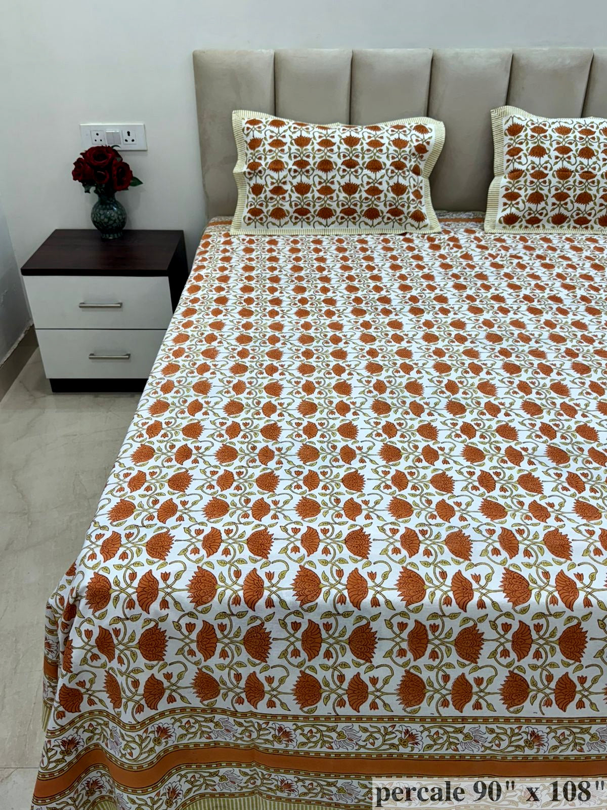 Hand Block Printed Double Bedsheet with Pillow Covers. This bedsheet is made from percale cotton, one of the finest fabrics for bed linens. It feels soft and comfortable on the skin. The fabric has a smooth matte finish with a crisp, fresh touch that gives a clean and premium feel.