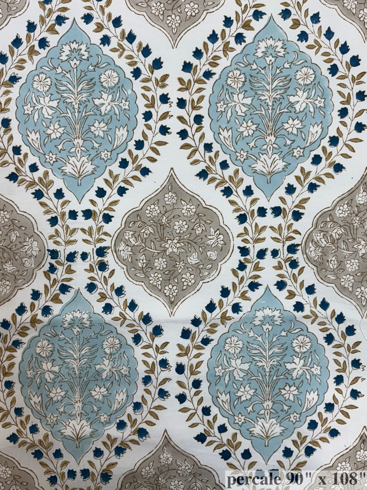 Hand Block Printed Double Bedsheet with Pillow Covers. This bedsheet is made from percale cotton, one of the finest fabrics for bed linens. It feels soft and comfortable on the skin. The fabric has a smooth matte finish with a crisp, fresh touch that gives a clean and premium feel.