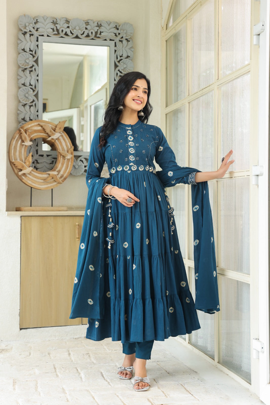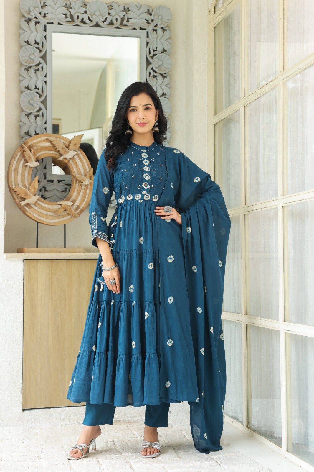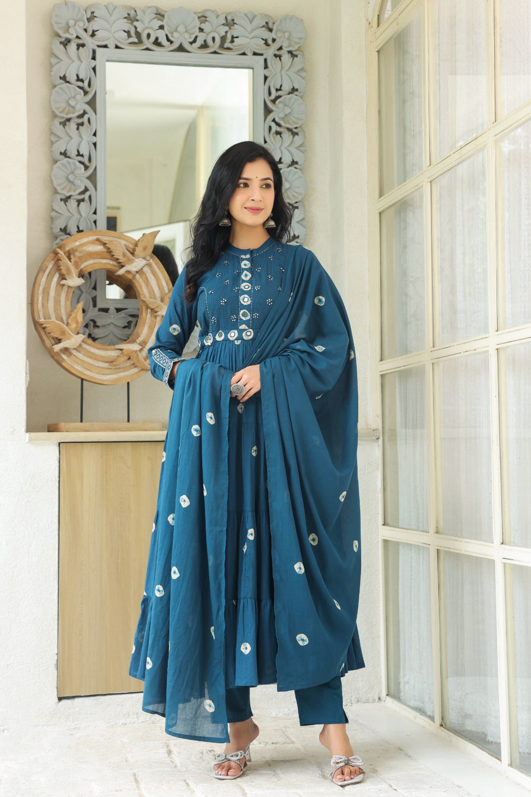 Teal Blue Fusion Mul Cotton Anarkali Suit